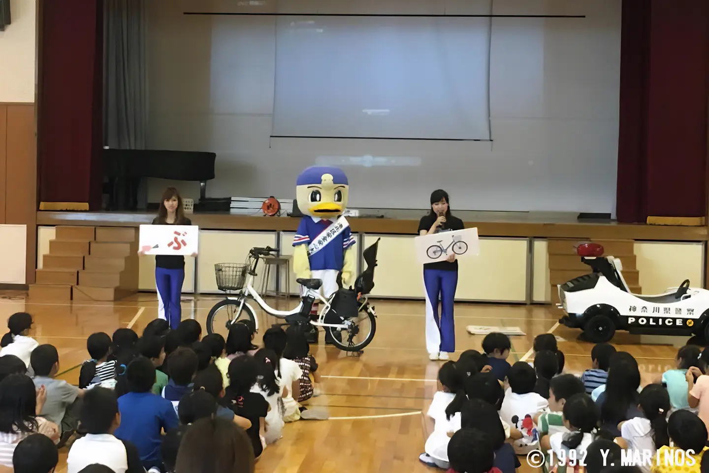 例えばですが、各地域の小学校、区役所、交通安全協会と連携して、児童たちを対象とした交通安全教室などに参加しています。クラブが主に関わるところはマスコットであるマリノスケや、公式チアチームのトリコロールマーメイズが訪問して、横断歩道の渡り方や自転車の乗り方などのお手本を見せたりします。意外かもしれませんが、サッカー以外のところでもさまざまな活動を行わせていただいています。