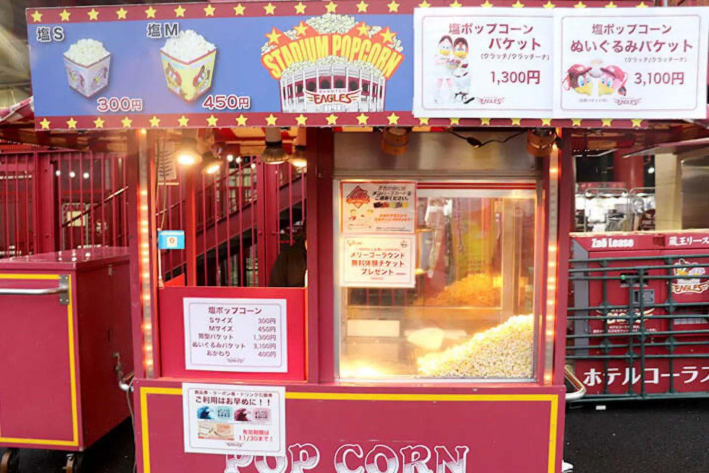 ワゴン販売のポップコーン。キャラクターのバケットもある。まるで……