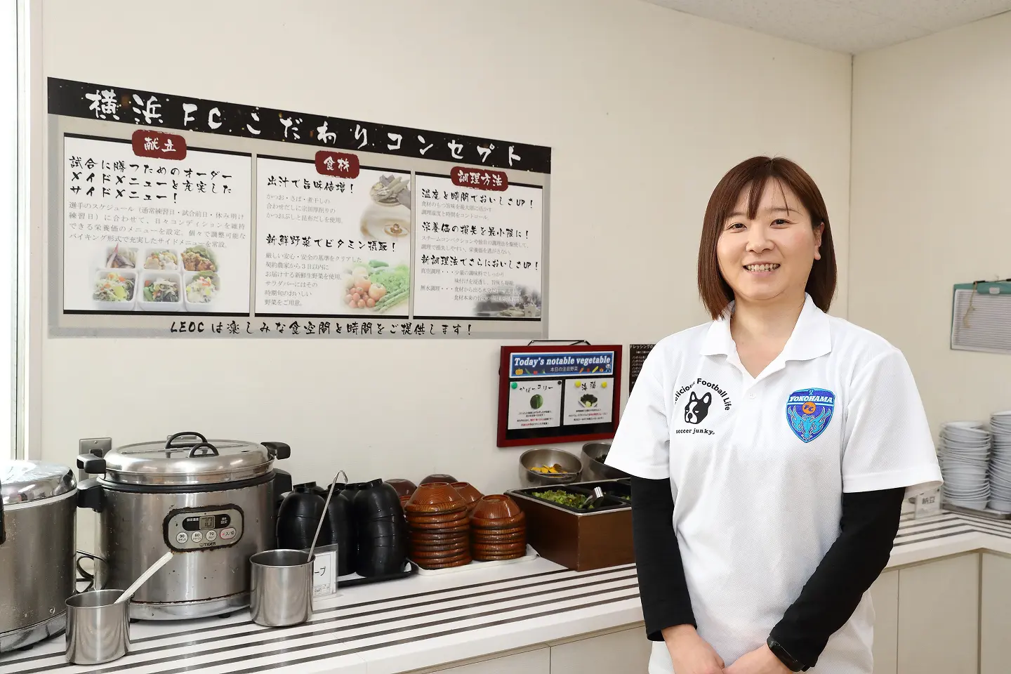 インタビュー取材を終えた後、国原さんとともに横浜FCのクラブハウス内にある食堂を訪問。当日の昼食メニューがどのような狙いで構成されているかをうかがった。