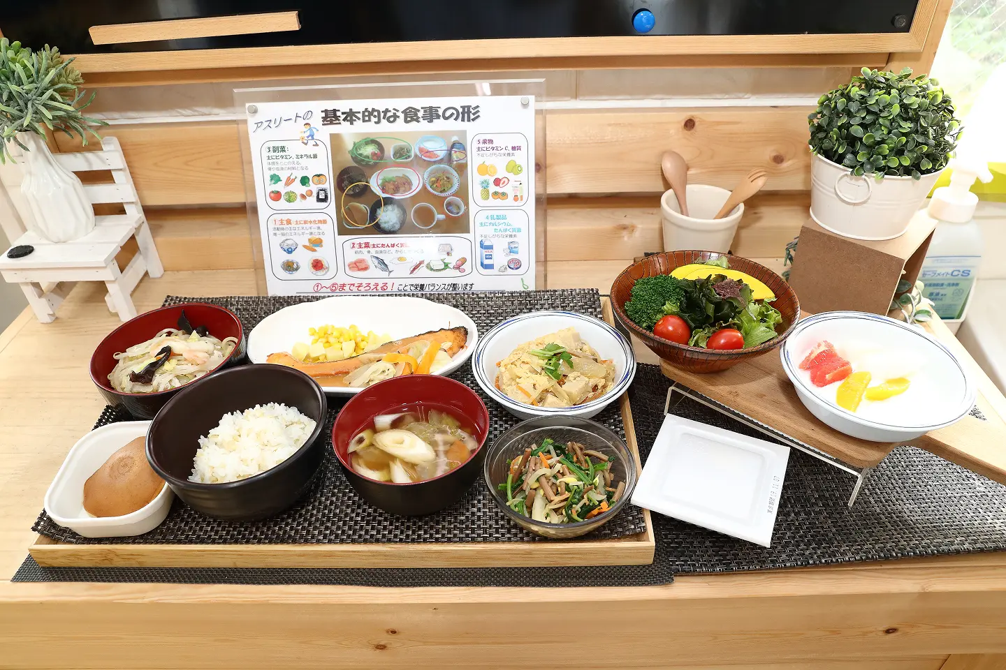 必要なビタミンとミネラルを摂れるように、みそ汁は野菜で具だくさんにしています。野菜も栄養密度が高く、抗酸化作用やエネルギーをうまく働かせる役割が強い緑黄色野菜を多く使っています。おかずのたんぱく源で体をつくって、主食の炭水化物で体を動かして、野菜のビタミンやミネラルでその動きをスムーズにする。そういうメニュー構成になっています。