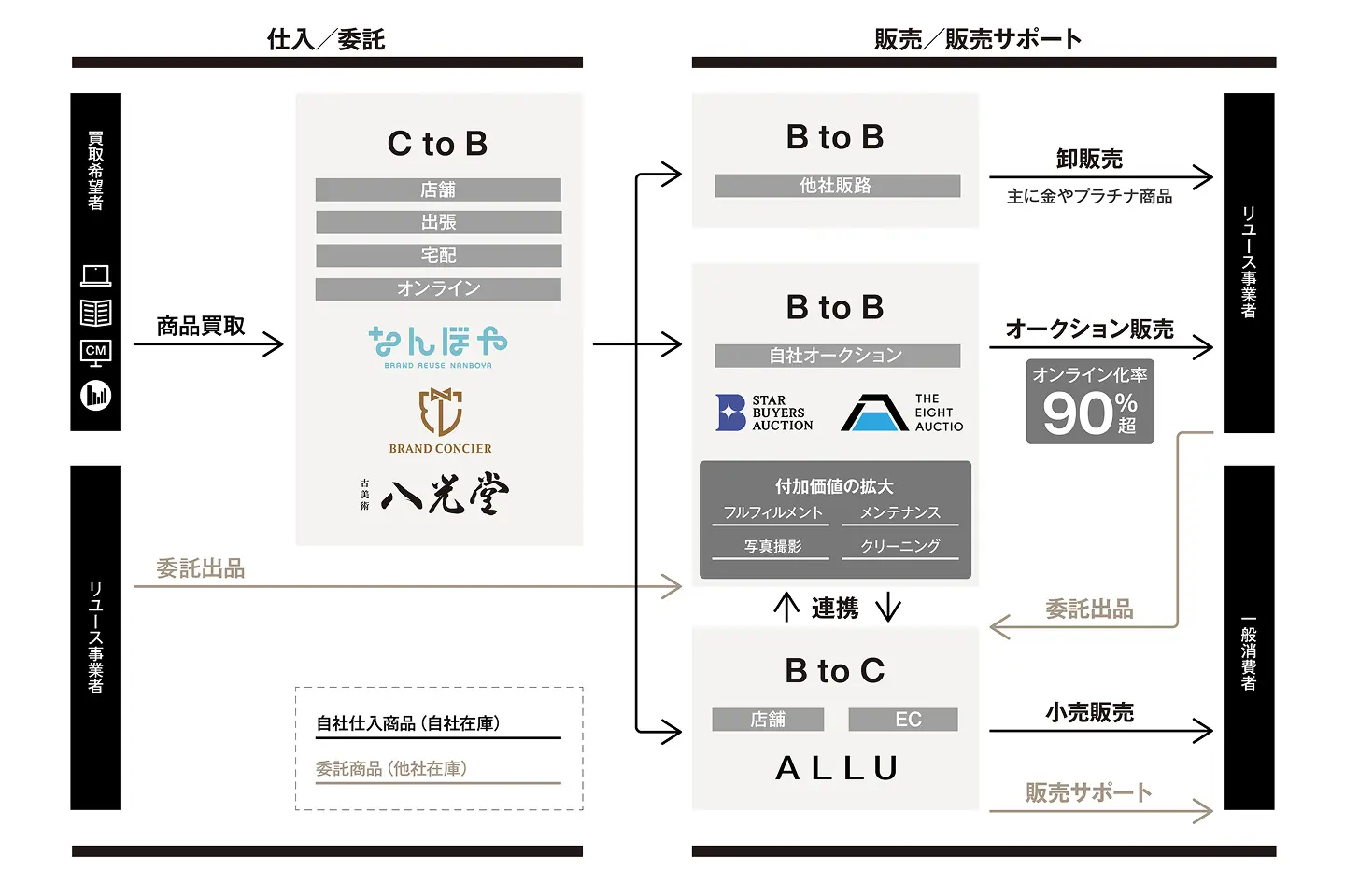 また創業当時のリユース業界は、繁華街に路面店を出店し、折り込みチラシ等の紙媒体広告で集客を行う手法が一般的だったなか、業界に先駆けてデジタルマーケティングを導入してきた。現在、Webを経由する顧客は9割を占めるという。WEB上で集客を行い、実店舗へ送客。買い取った商品の検品・メンテナンスを行った後に複数の販路で販売する。この“CtoBtoB”のビジネスモデルによって、業界で確固たる地位を築き上げてきたのだ。