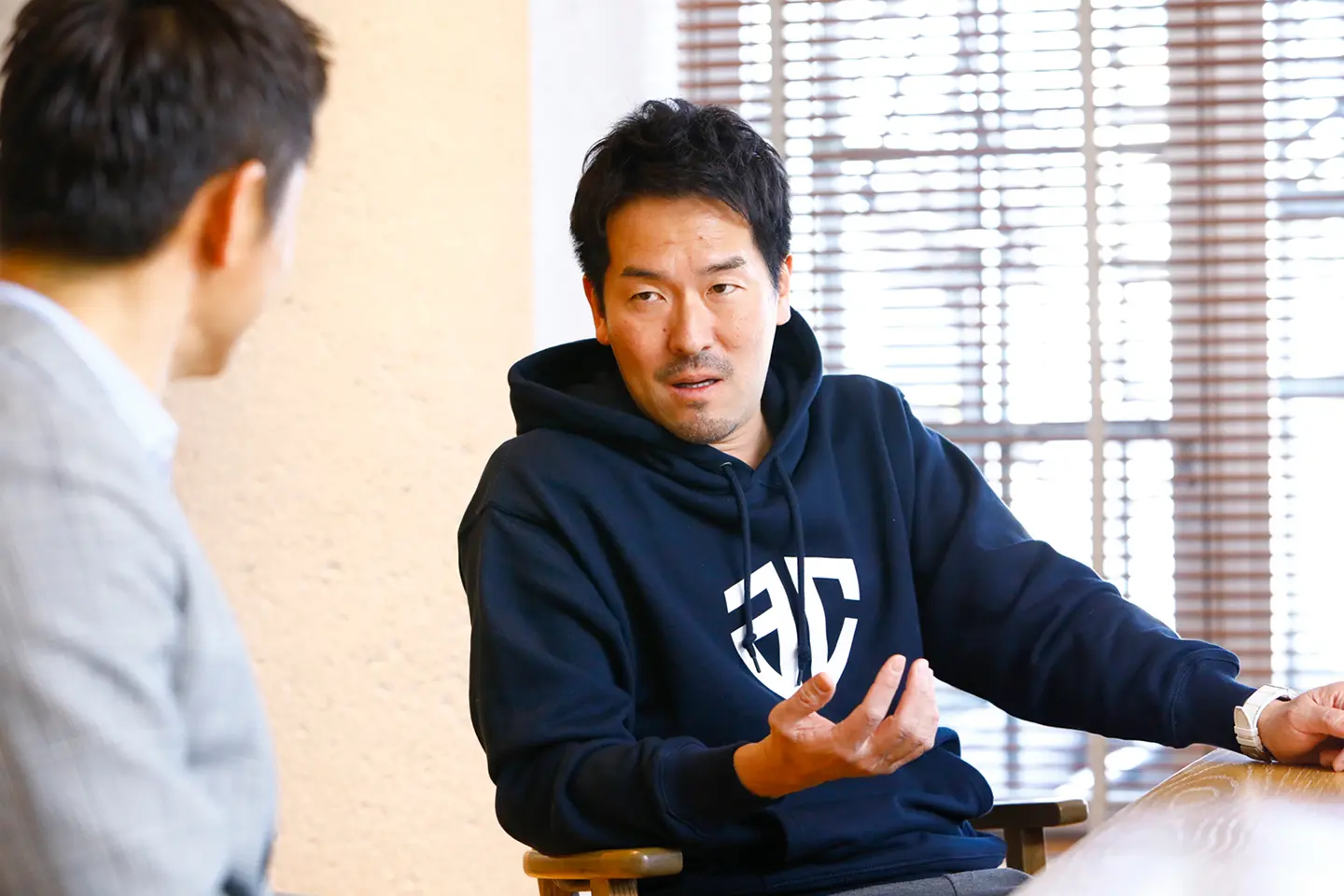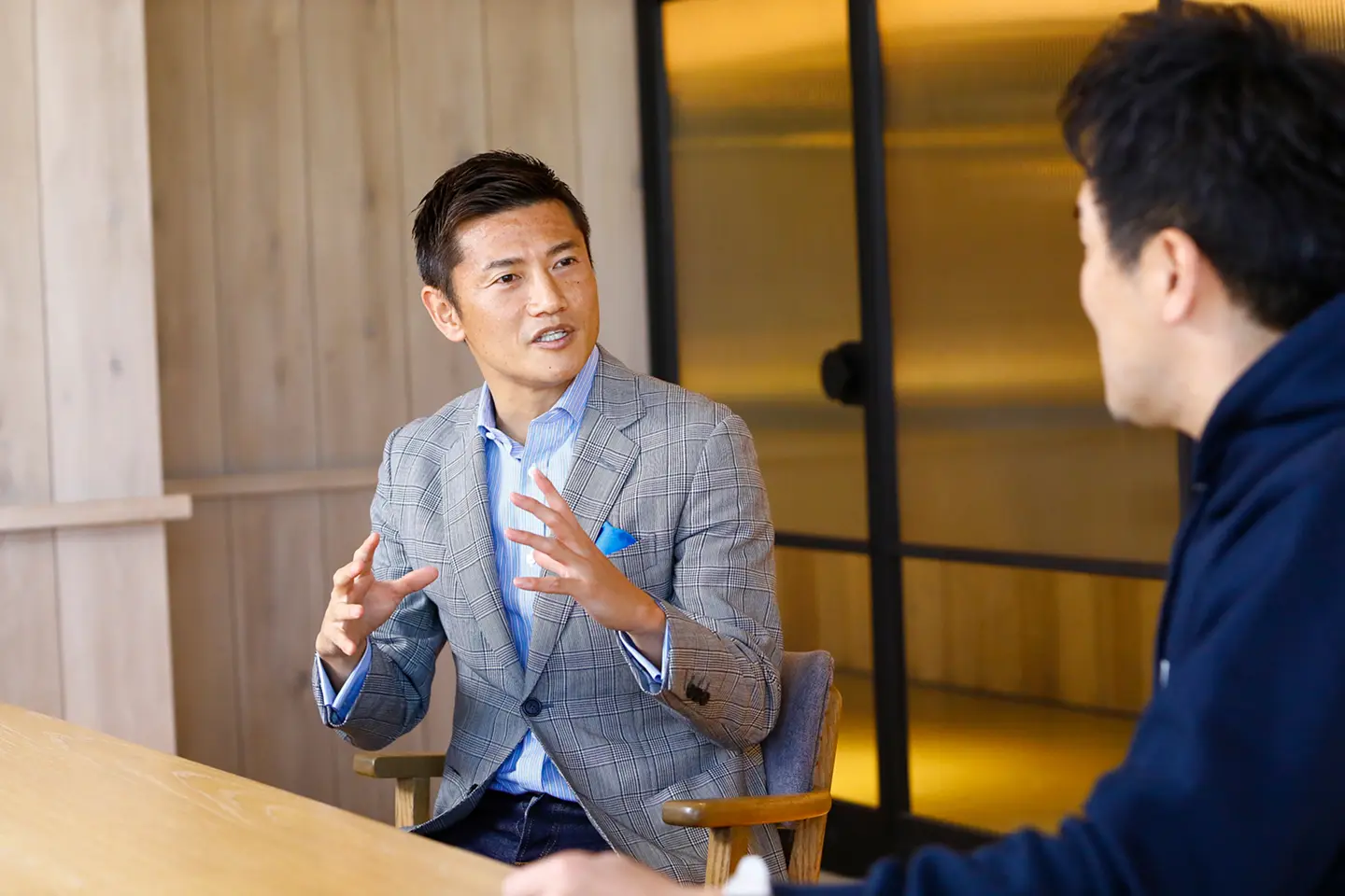 サッカー部時代は「とにかく攻撃が好きで、ずっとフォワードだった」という新居さん。ともにフォワードタイプの経営者同士、スポーツビジネスの未来を熱く語り合った[写真]冨田峻矢