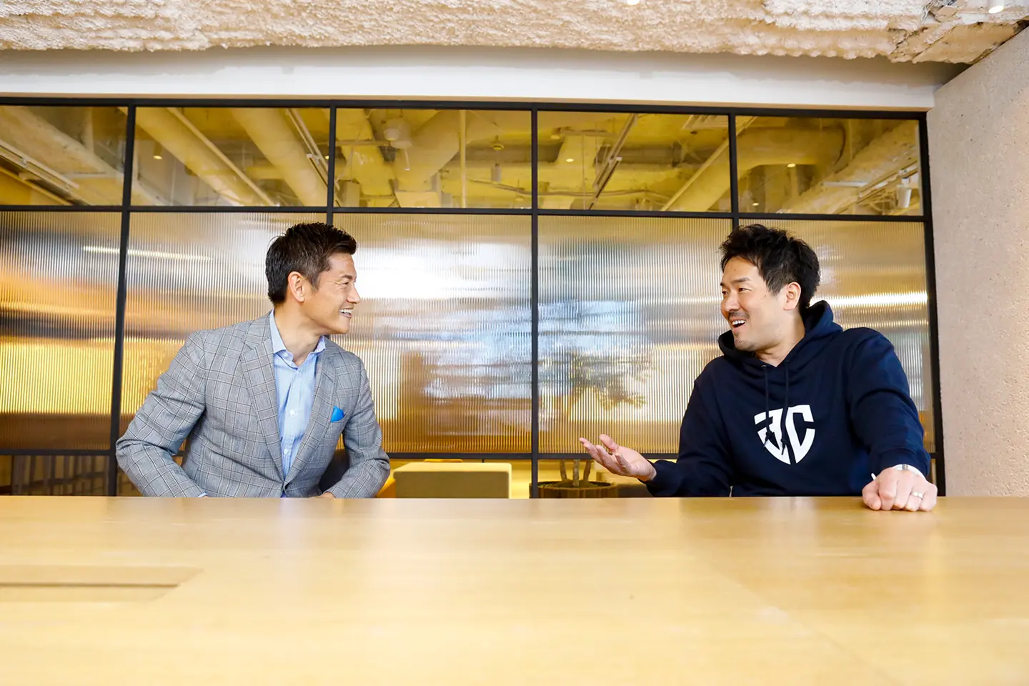 学生時代はサッカーに明け暮れ、会社設立時も「サッカーチームのような組織を目指した」という新居さんに、播戸さんが鋭くインタビューしていく[写真]冨田峻矢