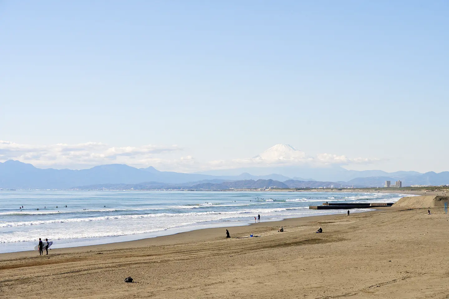 大村さんのホームポイントである鵠沼海岸。右手には富士山、左手には江の島がよく見える [写真]中野賢太