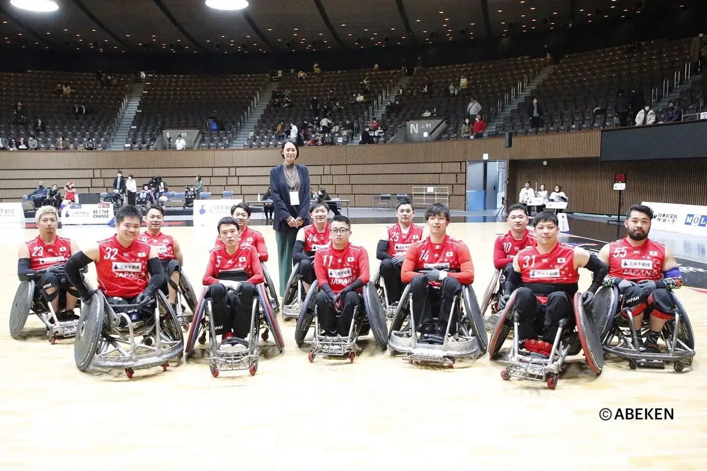 2022年に日本車いすラグビー連盟の理事に就任した大山さん。写真は連盟主催の大会に出場した日本代表選手と[写真]ABEKEN