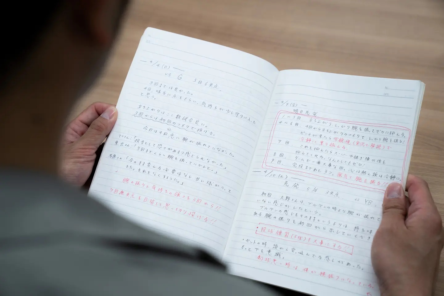 壁にぶつかるたびに野球ノートを見返す。「過去の自分が、壁の乗り越え方を教えてくれるんです」と語った[写真]清水真央