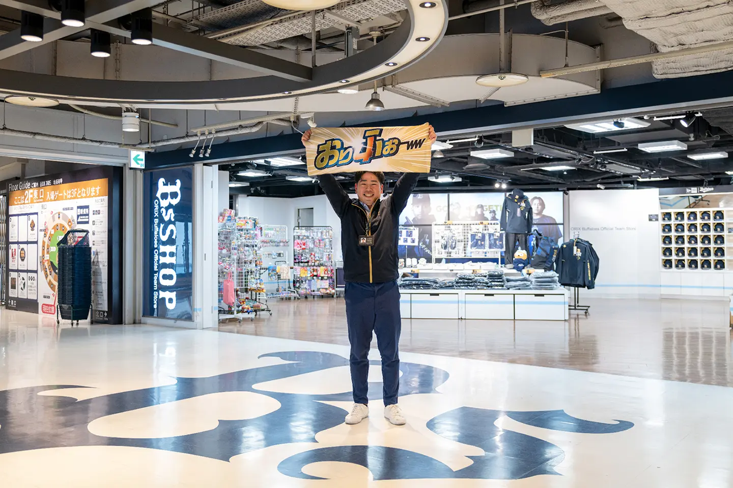 ぼくは京セラドーム大阪2階にあるオリックス・バファローズオフィシャルグッズショップ「Bs SHOP」の店長を務めています。バファローズはパ・リーグ3連覇と、2022年には26年ぶりの日本一といった好成績のおかげで人気が高まり続けており、グッズショップの販売でも期待以上の数字を挙げています。