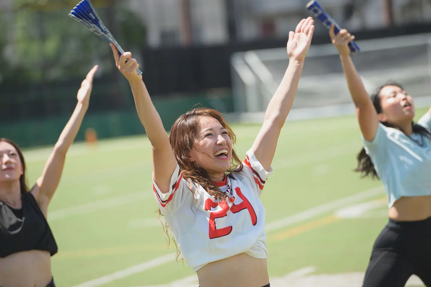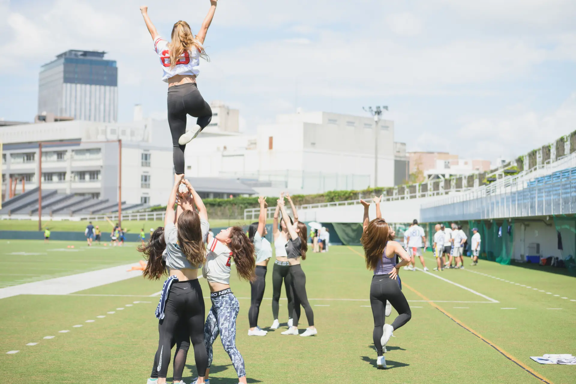 日本社会人アメリカンフットボールのトップリーグ「Xリーグ」で常に会場を盛り上げ、選手にエールを送るチアリーダー。試合が劣勢でも笑顔で選手と観客を鼓舞し、試合終盤も疲れを感じさせないほど元気で、裏にある努力を感じさせない。
