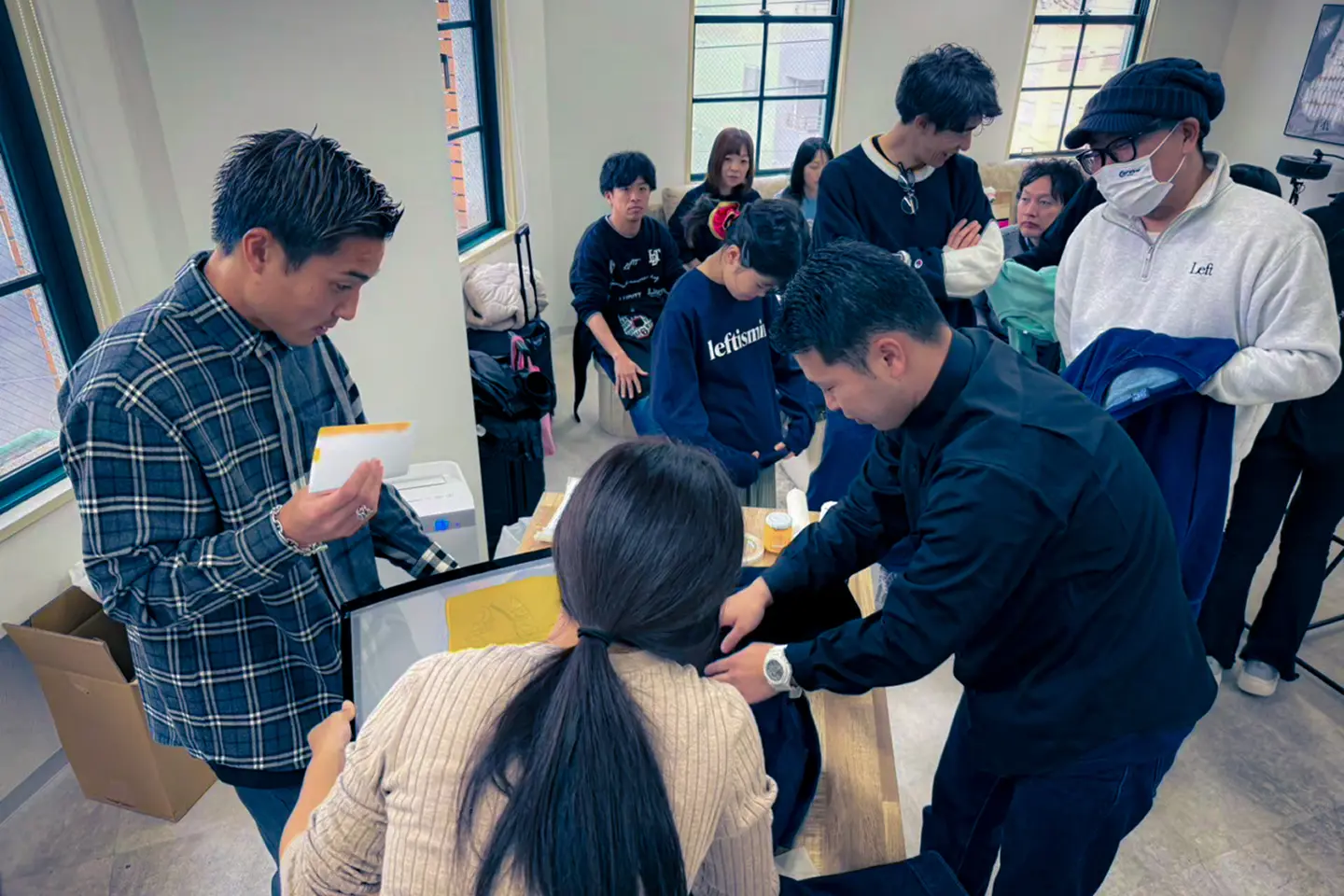 プロサッカー選手・山中亮輔さん(写真左)が企画したアパレルカスタムイベント。山中さんお手製のデザインをファンの私服にペイントするなど大盛況だった[写真]本人提供