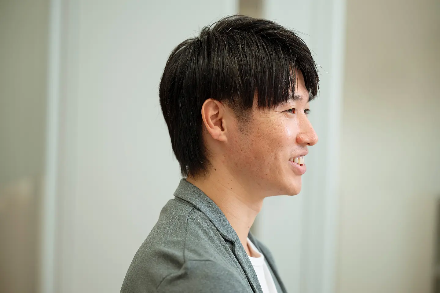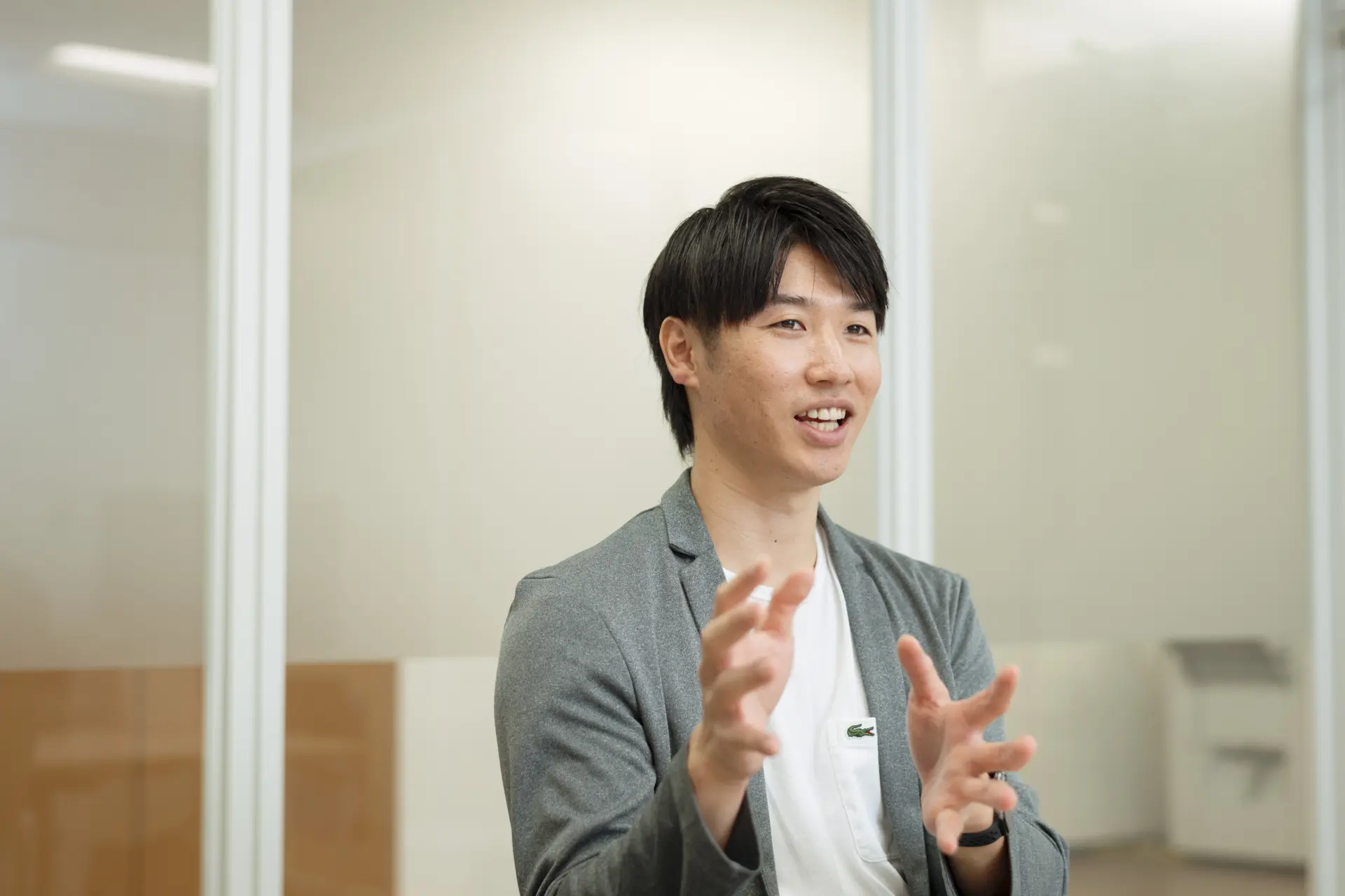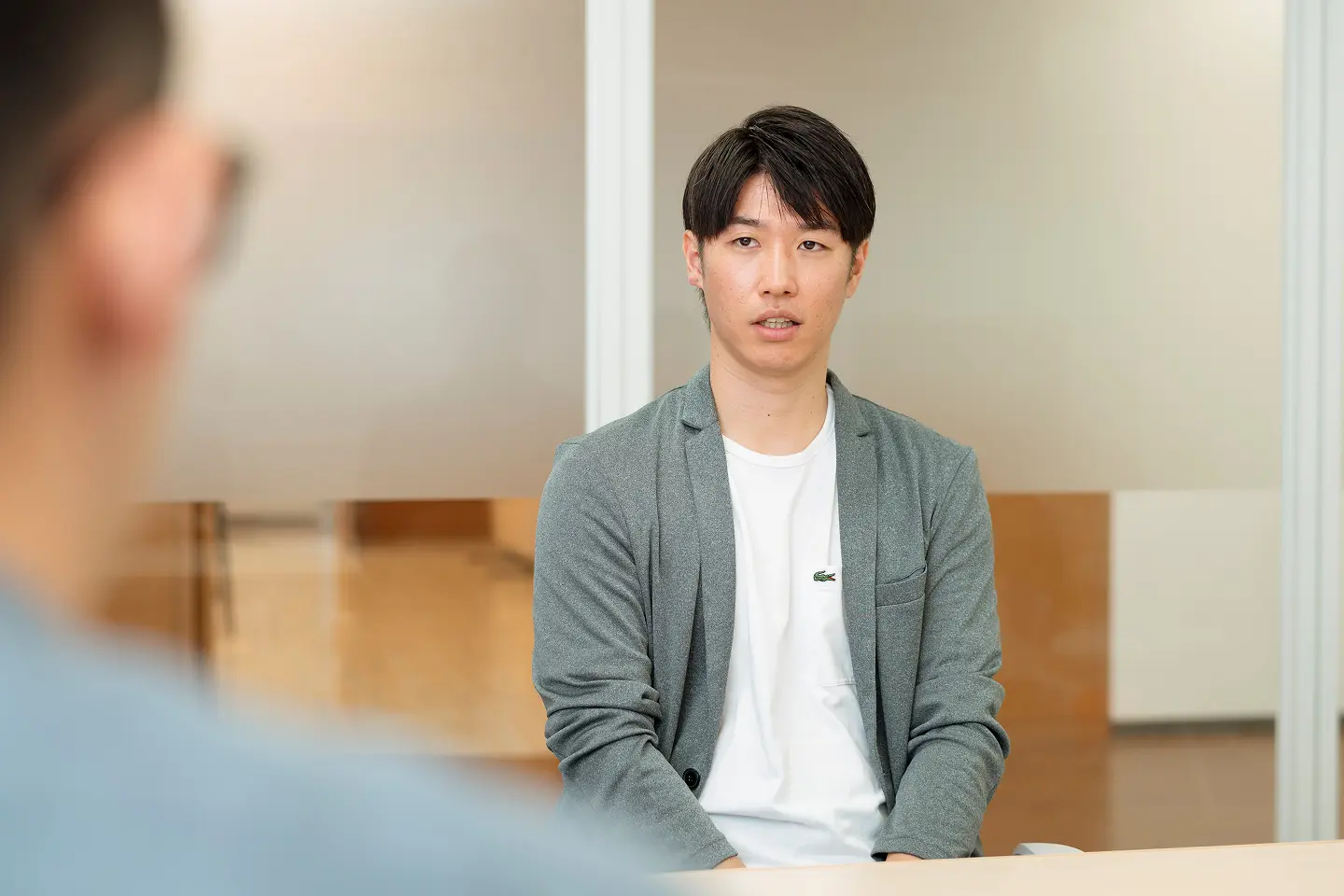 「営業のプレゼンみたいな説明をしていたので、今の仕事の練習ができていたとポジティブに考えています(笑)」と転職活動中のことを笑顔で振り返った[写真]渡邉彰太
