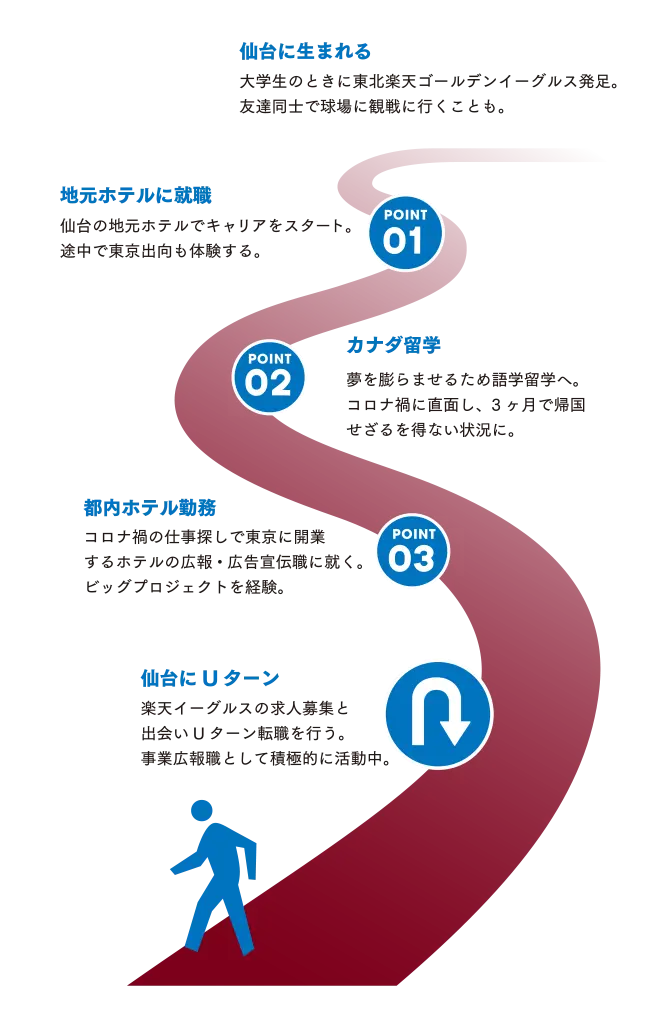 それでも両親が高齢になってきたこともあり、仙台に戻りたいという気持ちが高まっていきました。ホテルの開業がひと段落すると、私は本格的にUターンを考え始めます。そんなときに目に飛び込んできたのが東北楽天ゴールデンイーグルスによる事業広報職の募集でした。