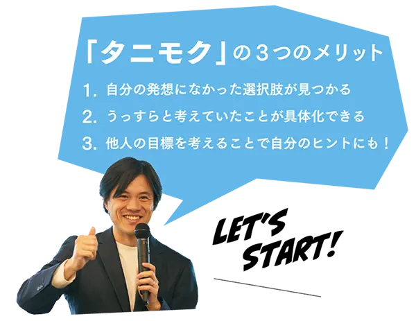 STEP1〜STEP4の方法で1人目の目標設定が終わったら、次の2人目の目標設定を同様の手順で行います。「タニモク」で提示された目標は、ワークショップ終了後、各自で内容を詳細化し、具体的なアクションを決め、「タニモク」をした同士で、LINE等で日々のアクションについてフィードバックしあうと、より目標達成に近づけます。