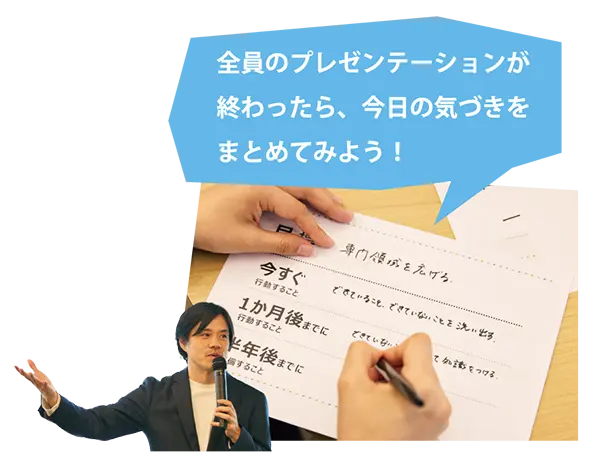いよいよ、他の人たちが本人の立場になって、自身が考えた目標の内容をプレゼン。それに対して本人は自由に質問を行い、「なぜその目標にしたのか」を深掘りするやりとりが、今回のコア部分でありクライマックス!!