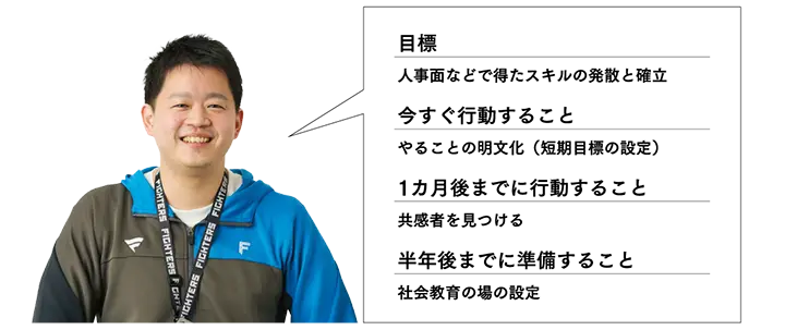 すごく不思議な感覚でした。人の目標について話しているうちに「いや、まずは自分がそれをやるべきだろ」と意識が高まったんです。具体的には会社横断。僕は社会教育をやりたいのですが情報収集で満足せず、会社の枠を越えてアウトプットしようと決意しました。球団でも新卒向けの研修に「タニモク」を取り入れてみようと思います。