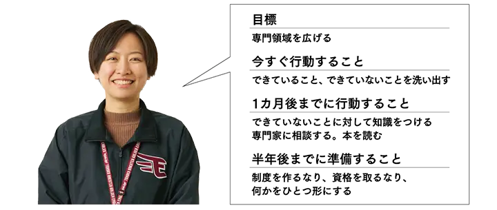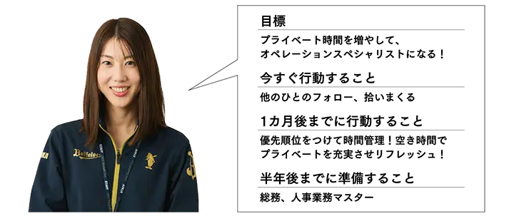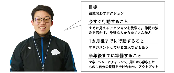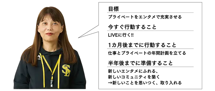 「タニモク」、すごく印象に残りました。潜在的に思っていることが文字としてアウトプットされたからです。自分が納得できる目標を立てるのにすごく良い手法ですね。私は現在、球団でプレイヤーとマネージャーの中間的役割を担っており、後輩を育てられていないというモヤモヤがあります。今後はマネジメントにも力を入れたいです。